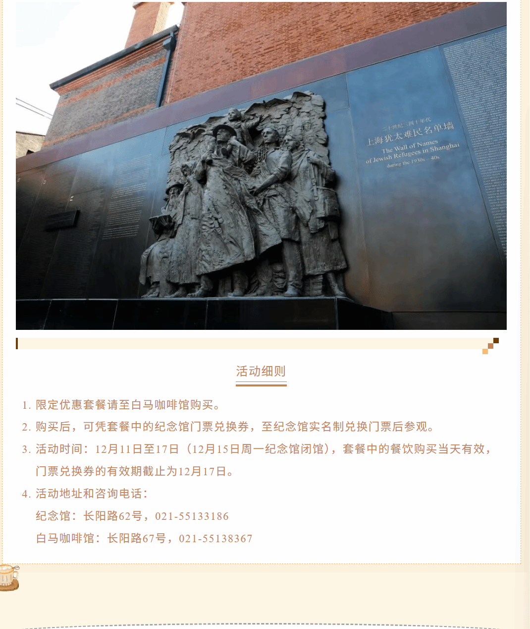 由上海市文旅局主办,相关部门和各区人民政府协办的“域见上海”第一届旅游攻略超级大赛(第一季)(简称“旅超”)已正式启动。即日起,上海犹太难民纪念馆携手白马咖啡馆推出限定优惠套餐,套餐内容为纪念馆门票兑换券1张+白马咖啡馆下午茶点1份(美式/拿铁1杯+提拉米苏1块),原价87元,现优惠价65元。欢迎大家前来打卡。
