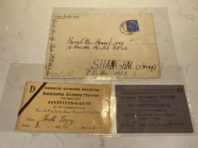Diener一来到纪念馆,就饶有兴致地介绍票根上的德文信息。两张票根是当时在上海避难的犹太难民分别在百老汇大戏院和东海大戏院参加活动的入场券,票根上详细标注了活动名称,参与者的姓名、座位号、票价等信息;而明信片上则显示了收件人、收件地址和留言。
