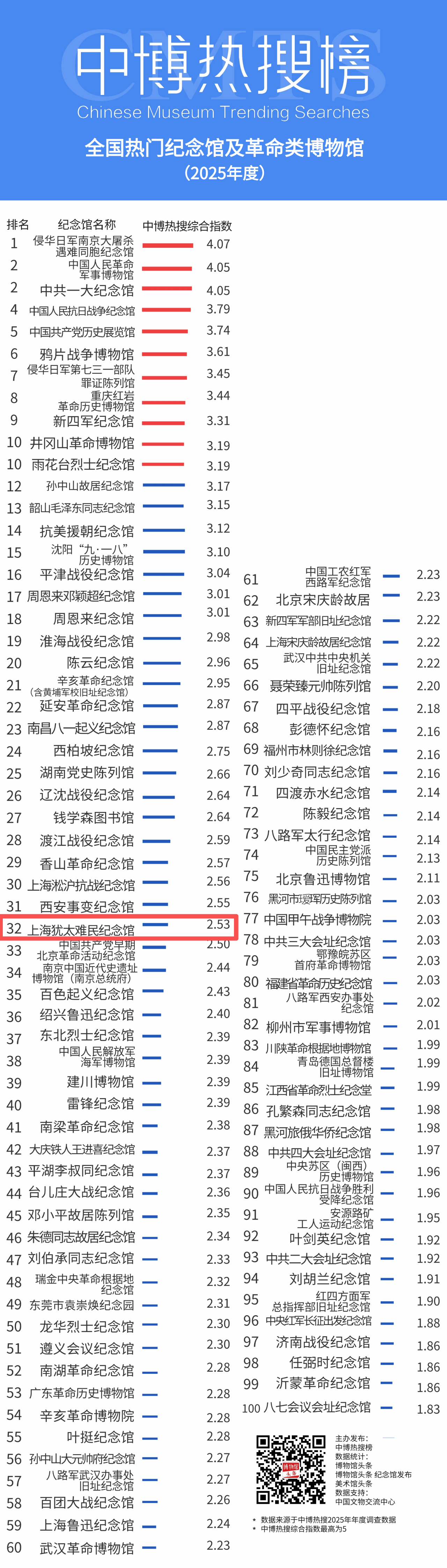 近日,由中博热搜榜主办发布,博物馆头条编辑部统计,中国文物交流中心数据支持的「中博热搜榜」2025年度榜单发布。上海犹太难民纪念馆表现突出,综合指数达2.53,位列“全国热门纪念馆及革命类博物馆”百强榜单第32位,较2024年全国榜单的名次进步2位。
