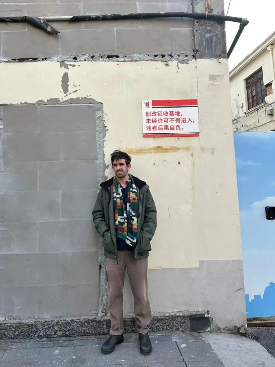 看到这张海报,尤尼十分激动,他想在结束参观后,以这张海报和祖母留下的老照片为线索,前往舟山路实地寻找当年烟草店的旧址,亲身见证这方祖辈当年在上海自力更生、顽强不息的小小天地。令人遗憾的是,舟山路沿线的大多数房屋和里弄的门牌号已经随着城市更新项目而被拆除,如今想要精准确定当年“舟山路159号”的具体位置,变得十分困难。尤尼祖母生前留下的老照片显示,当年的烟草店旧址位于街角处;而海报上“临近菜场”的提示,则标志着店铺位置就在舟山菜场附近。综合这些线索,尤尼最终选择在舟山路157弄旁的一栋街角建筑前停下脚步,并拍下了自己与这栋建筑的合影。
