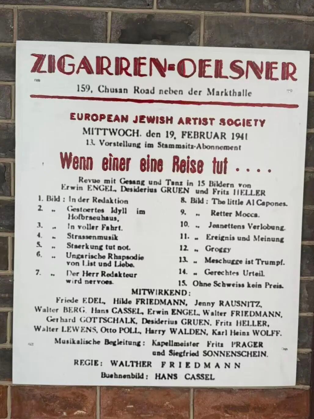 纪念馆二层的连廊上,陈列着许多根据历史照片和影像资料而还原的犹太难民在沪生活的海报与广告,记载着这段难忘的岁月记忆。就在尤尼驻足浏览这些展品时,一张海报让他停下了脚步。海报上赫然印着一行他再熟悉不过的文字——Zigarren-Oelsner,其中的Oelsner,就是祖母一家的姓氏。这是一张德语海报,经尤尼仔细辨认确认,海报的上半部分,正是祖母家当年开设的烟草店广告,不仅清晰标注着店名和“舟山路159号”的店铺地址,还贴心标注了“临近菜场”的提示;海报的下半部分,则是一则“欧洲犹太艺术家协会”的演出公告。