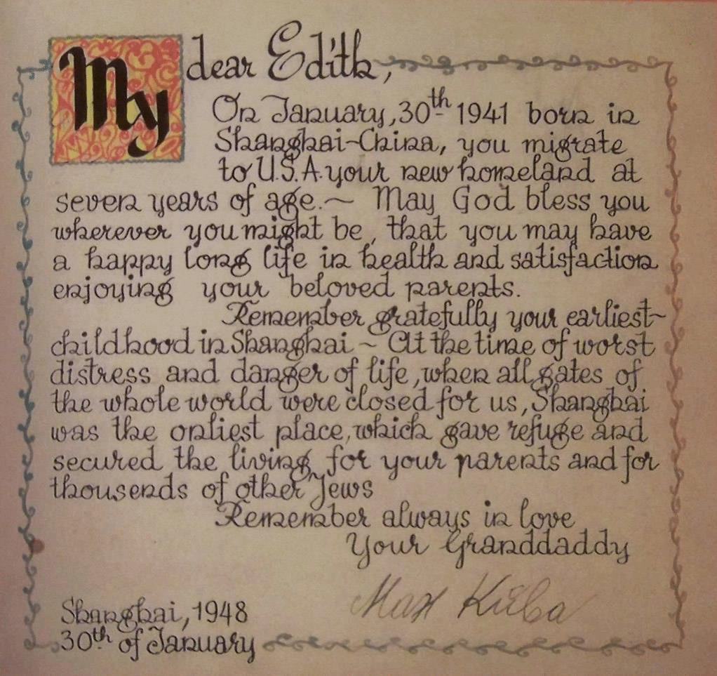 1941年1月30日,曼弗雷德和格尔达的女儿伊迪丝出生,她的童年没有玩具,只能在父亲的烟草店里玩耍,一家三口挤在这间小店里熬过了缺水缺暖气、卫生状况恶劣、疾病频发的艰难岁月。战争结束后,伊迪丝与父母于1948年在亲友的担保下前往美国。临行前,因波兰血统无法一同入境的麦克斯,在给将满7岁的孙女伊迪丝的生日贺卡写下了充满爱意的祝福:“你于1941年1月30日在中国上海出生,7岁那年踏上了前往美国——你未来家园的道路。请欣然忆起你在上海最早的童年时光。在那充满艰险、生命危殆的岁月,当整个世界的大门都对我们紧闭时,上海是唯一给予你父母及成千上万犹太人庇护与生机的地方。——永远爱你的祖父”。