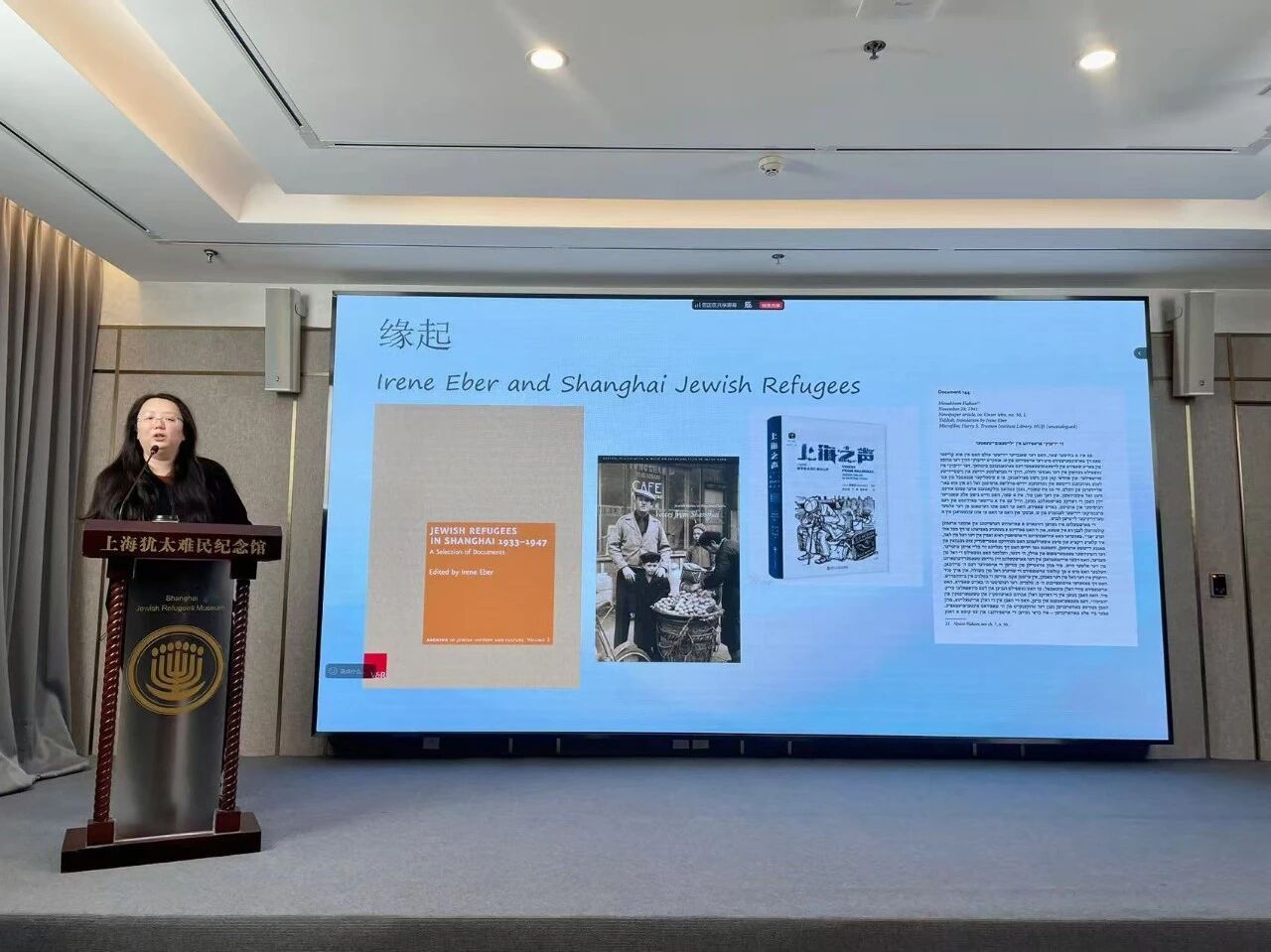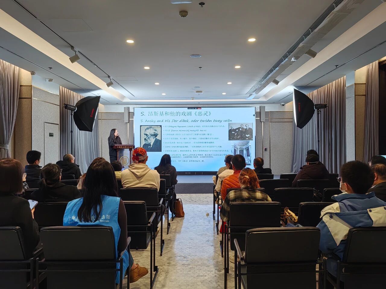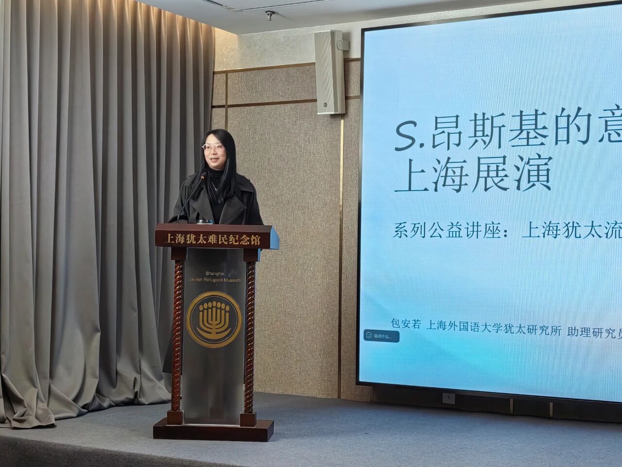 2025年12月18日,“上海犹太流亡文学:中国叙事与当代回响”系列公益讲座第六期——《S.昂斯基的意第绪语戏剧及其上海展演》在上海犹太难民纪念馆成功举办。本期讲座由上海外国语大学中国话语与世界文学研究中心、上海犹太难民纪念馆、上海全球治理与区域国别研究院联合主办,上海外国语大学犹太研究所助理研究员包安若主讲,中国话语与世界文学研究中心助理研究员童欣主持,吸引了众多对上海近代历史、东欧犹太文学与文化感兴趣的学者与市民参与。